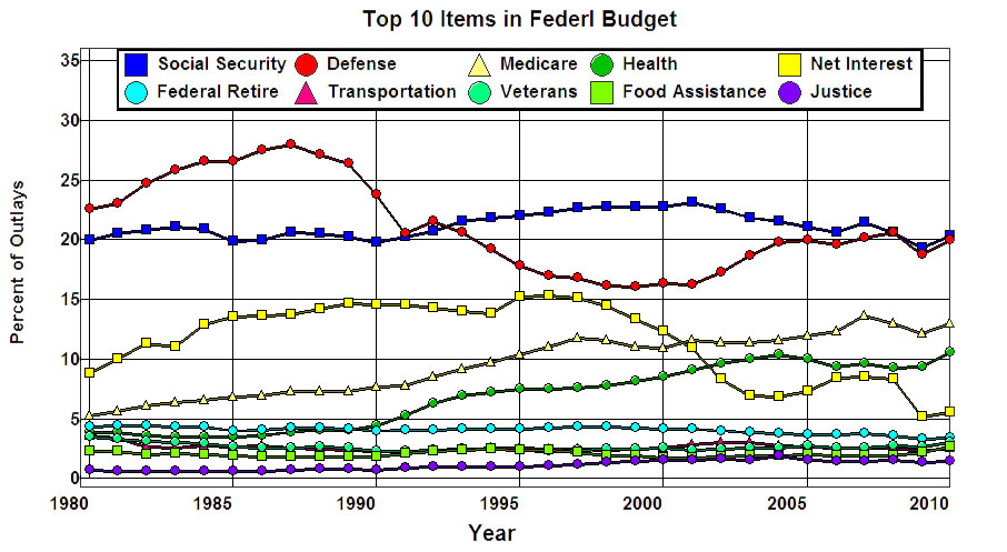 budget has been dominated by Social Security, Defense, Medicare, and Health.